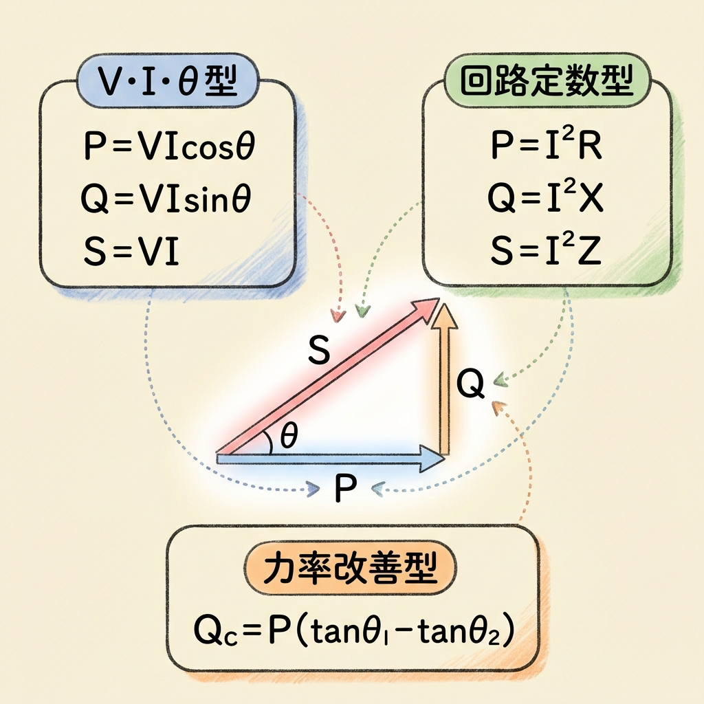 基本公式 P = VIcosθ、Q = VIsinθ、S = VI、S² = P² + Q²