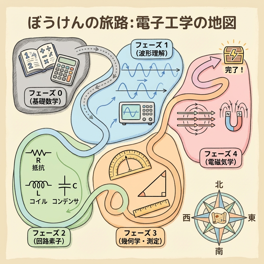 この記事は、交流回路の学習を「20の小さなステップ」に分解し、どこから始めて、どの順番で学べばいいかを示す「迷子にならない地図」です。