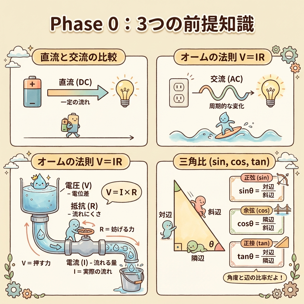 三相交流は、単相交流の「3つ束ねバージョン」です。Phase 1〜3の内容が理解できていない状態で三相に入ると、100%混乱します。不安があるなら、一度Phase 1〜3に戻って復習してから進んでください。