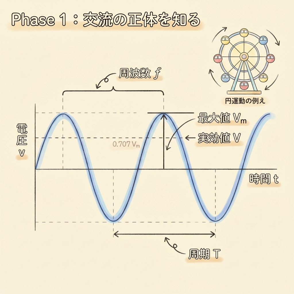 Phase 0をクリアしたあなたは、いよいよ交流の世界に入ります。このフェーズでは、「交流とはどんな波か?」を理解します。まだ回路は解きません。まずは「波そのもの」を知ることが大事です。
