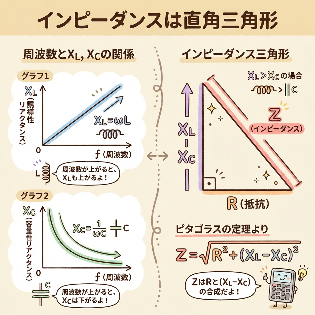 10 インピーダンス Z = √(R² + (XL-XC)²)、V = IZ