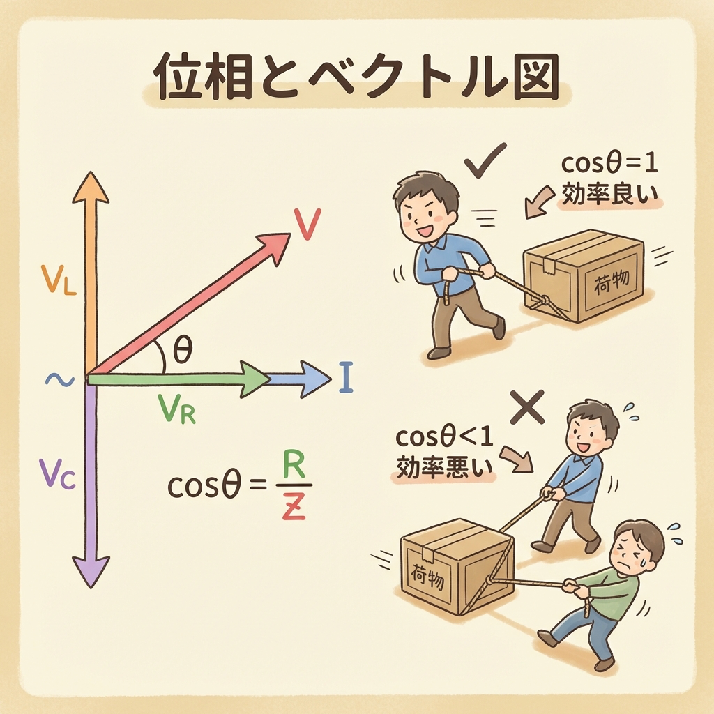 「電流が遅れるって何?」という疑問は、文章だけ読んでも解消しません。ベクトル図を自分の手で描くことが最も効果的です。矢印を描いて、回して、視覚的に理解してください。