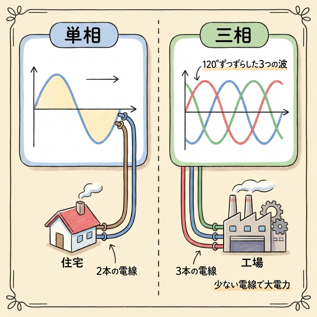 【完全図解】単相と三相の違い|「家のコンセント」と「工場の電気」はなぜ違う? →