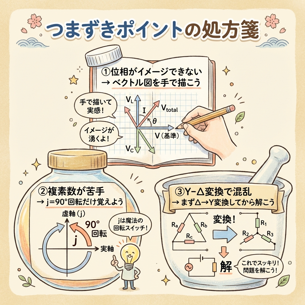 20ステップを進める中で、きっと「ここがわからない!」という瞬間があるはずです。交流回路で多い3大つまずきポイントと、その対処法をまとめておきます。