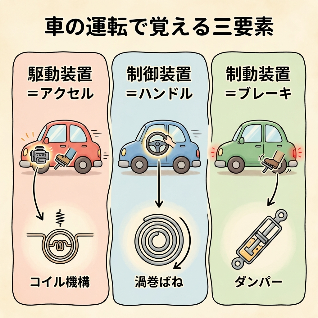 • 「駆動装置」「制御装置」「制動装置」の違いがごちゃごちゃになる…