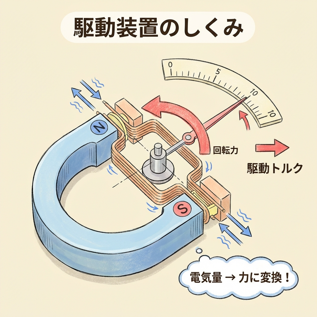 駆動装置は、測定したい電気量(電圧・電流など)を「駆動トルク」という回転力に変換して、指針を動かす装置です。