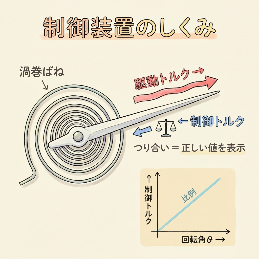 制御装置は、駆動トルクに対抗する「制御トルク」を発生させて、針を測定量に応じた正しい位置で止める役割を持ちます。