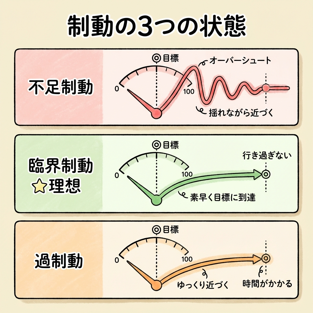 → 理想は「臨界制動」(最速で揺れずに到達)。