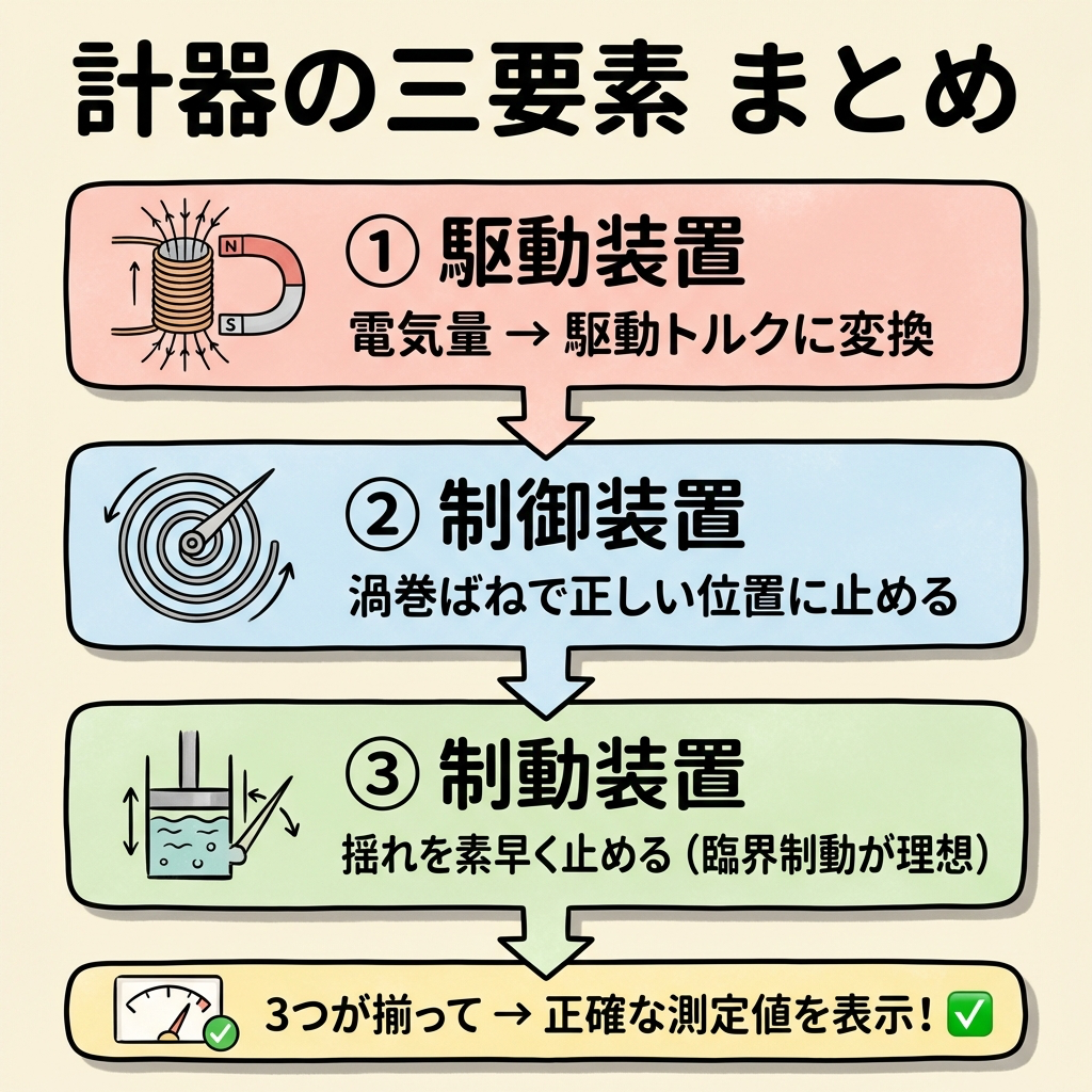 計器の三要素は、「走る → 止まる位置を決める → 揺れを止める」という順番で理解すれば、もう混乱しません。