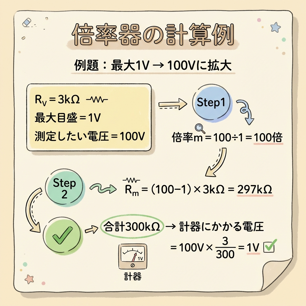 合計抵抗 = 297kΩ + 3kΩ = 300kΩ。電圧計にかかる電圧 = 100V × (3kΩ / 300kΩ) = 1V。ちゃんと最大目盛に収まっていますね!