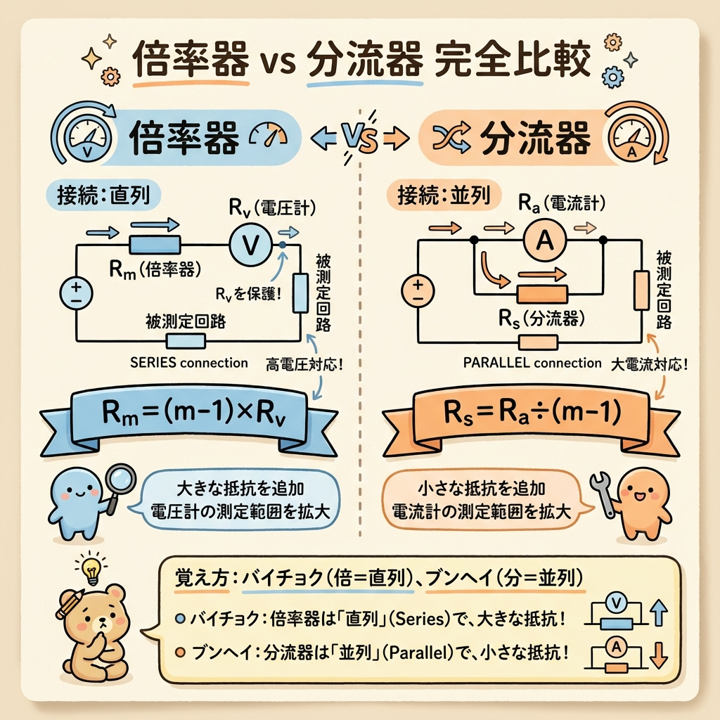 倍率器は「大きな抵抗を追加」、分流器は「小さな抵抗を追加」と覚えましょう。電圧計は直列で大きく、電流計は並列で小さく、です。
