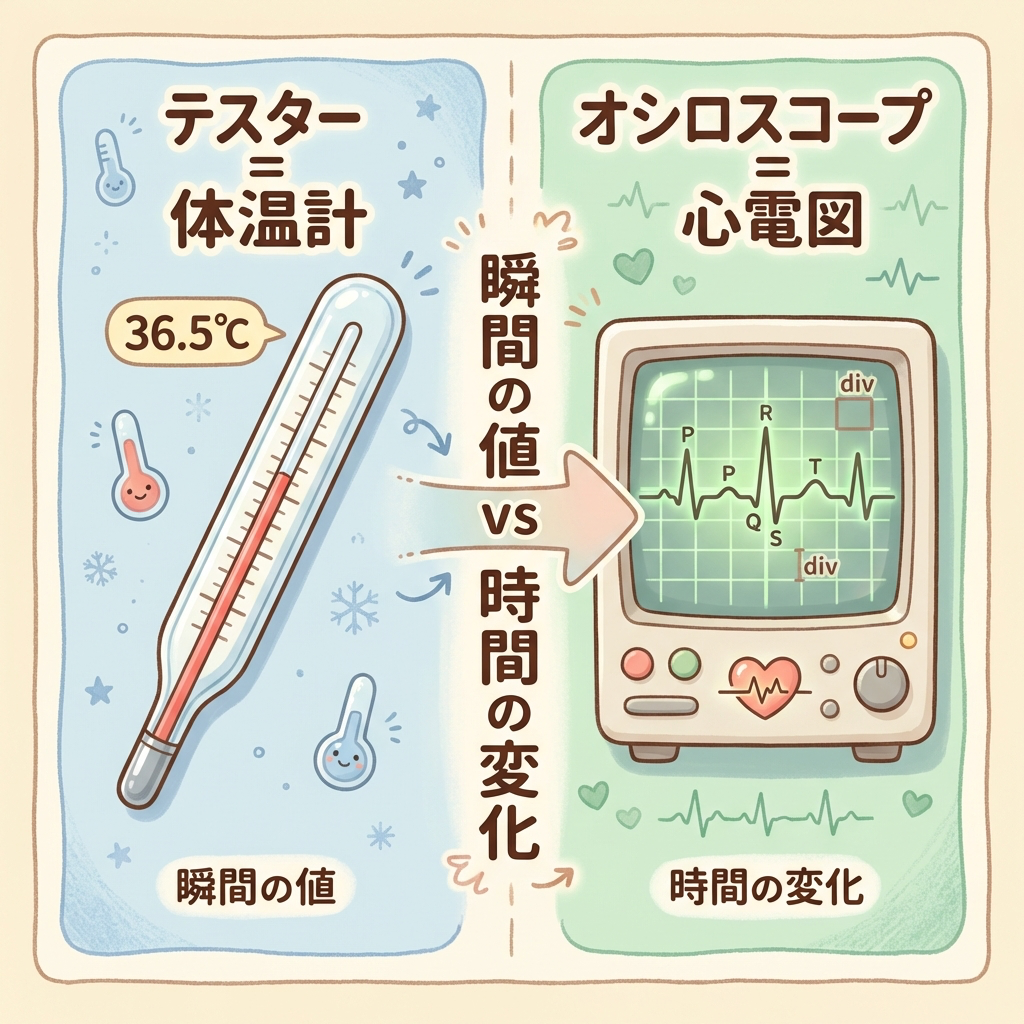 たとえるなら、テスターが「体温計」だとすれば、オシロスコープは「心電図モニター」のようなもの。体温計は一瞬の値しかわかりませんが、心電図は時間の流れとともに心臓の動きを線で描きますよね。オシロスコープもまさに同じ原理です。