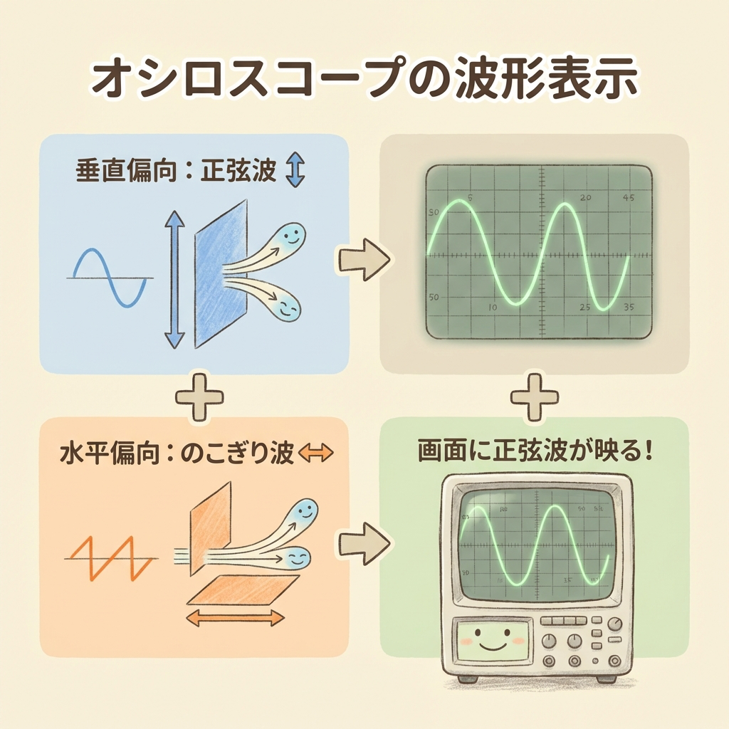 | 垂直偏向電極 | 測定したい信号(正弦波など) | 光の点を上下に動かす |