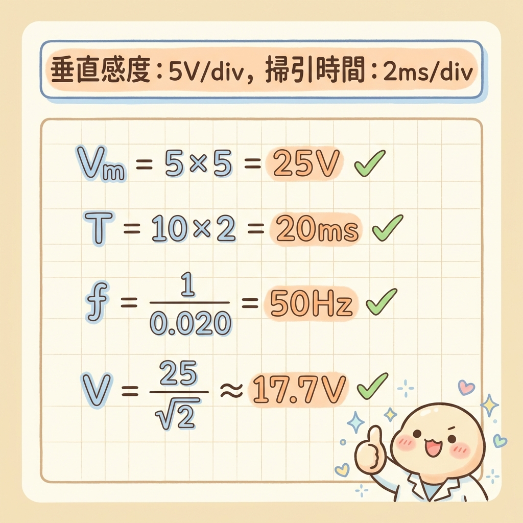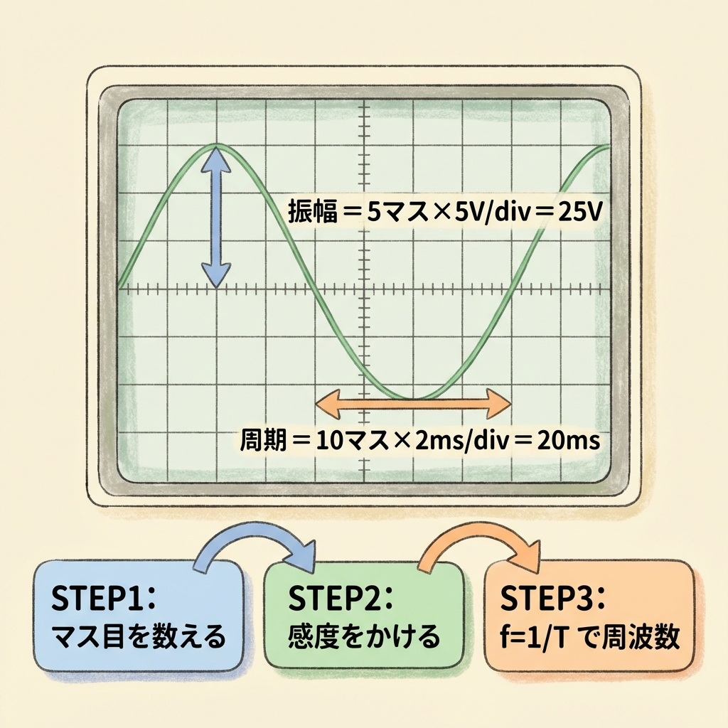 - 波形の読み方は「マス目を数える → 感度・掃引時間をかける → 公式に入れる」の3ステップ