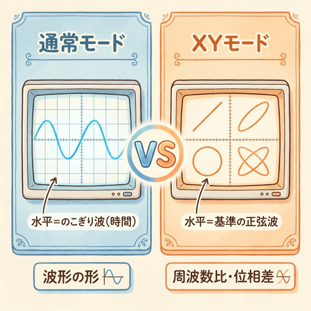 | 位相差 | 楕円の傾き・形で判定 | 回路の位相特性を調べる |