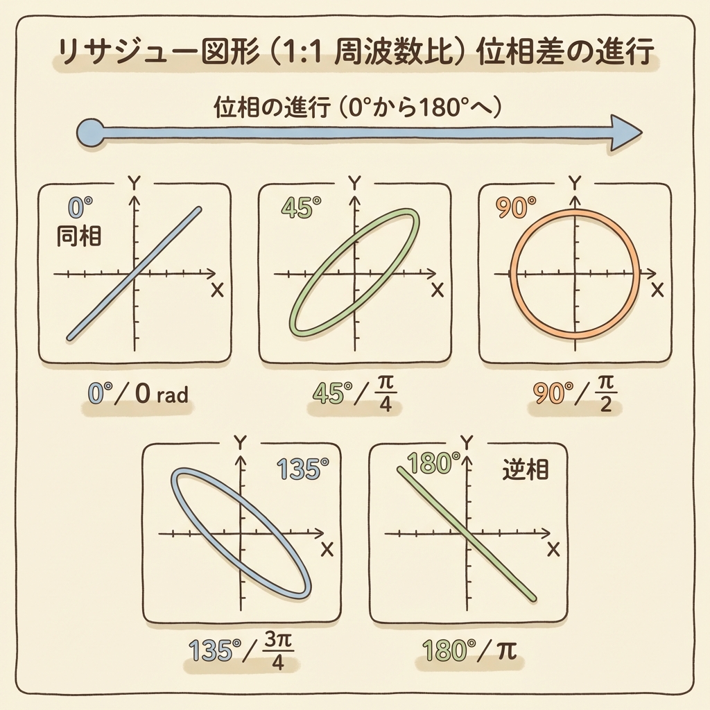 | 0°(同相) | 右上がりの直線(╱) | 同じタイミングで動く → 一直線 |