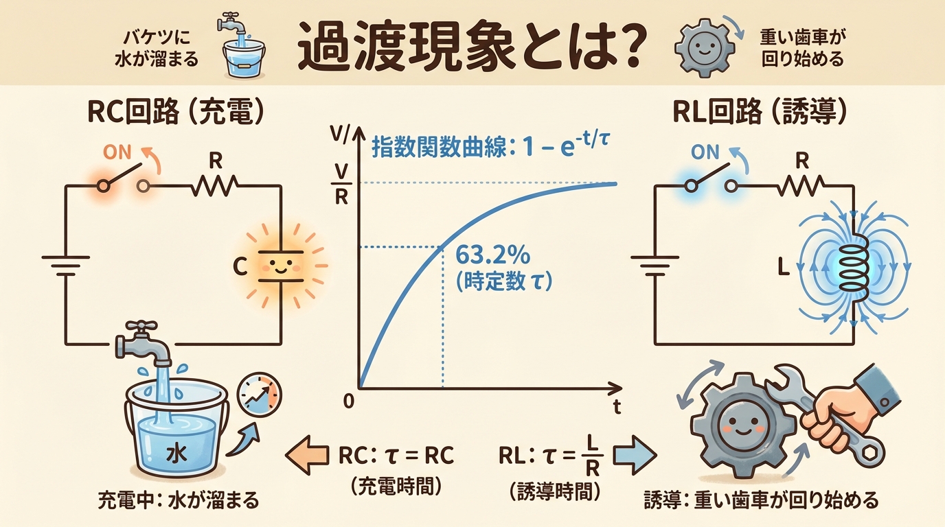 この記事では、微分方程式は一切使いません。「なぜそうなるのか」を日常の例えと図解で徹底的に説明し、初心者が過渡現象の全体像をつかめることをゴールとします。