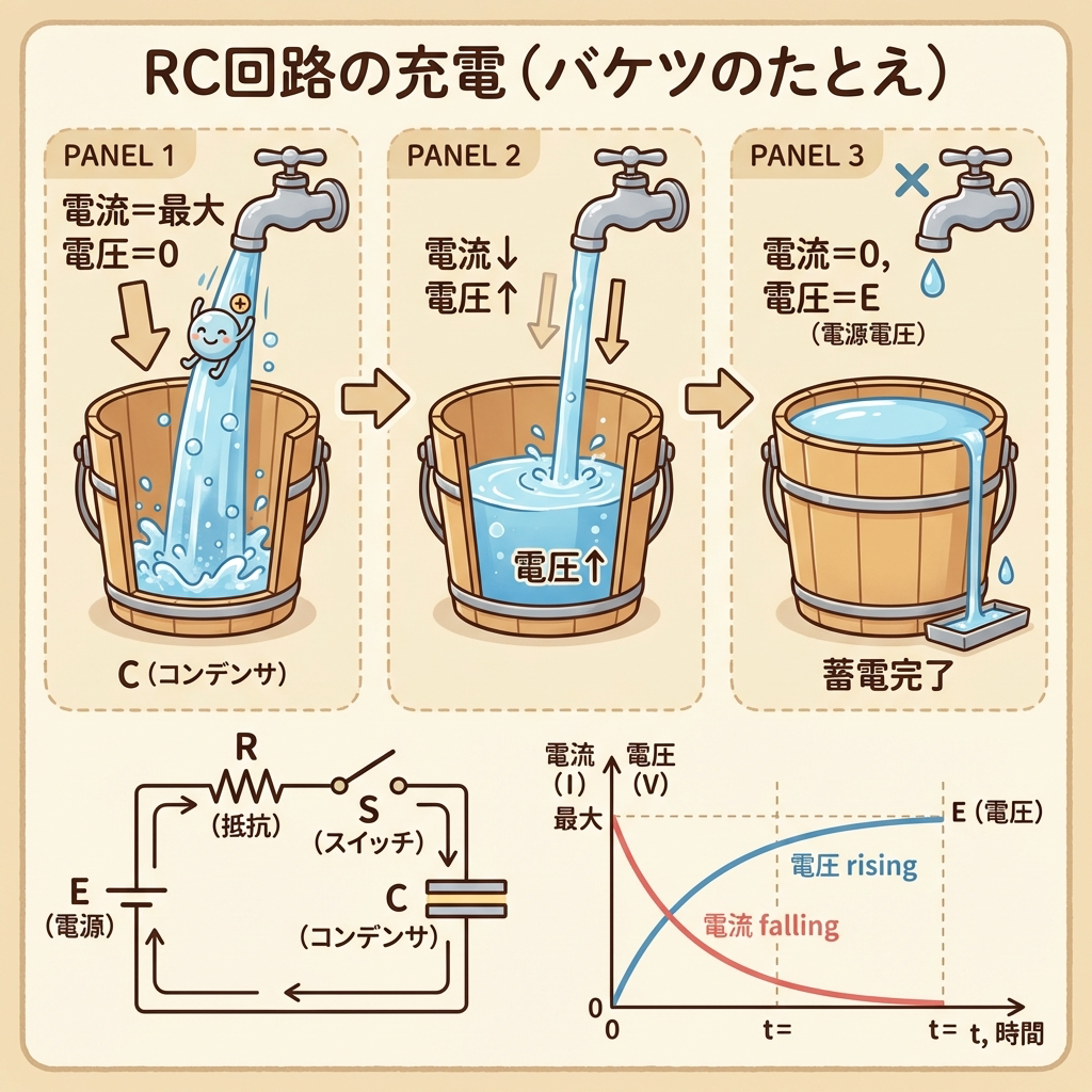 📌 例え:空のバケツに水を注ぐイメージ。蛇口を全開にしても、バケツの水位(=電圧)は一瞬で満杯にはならない。