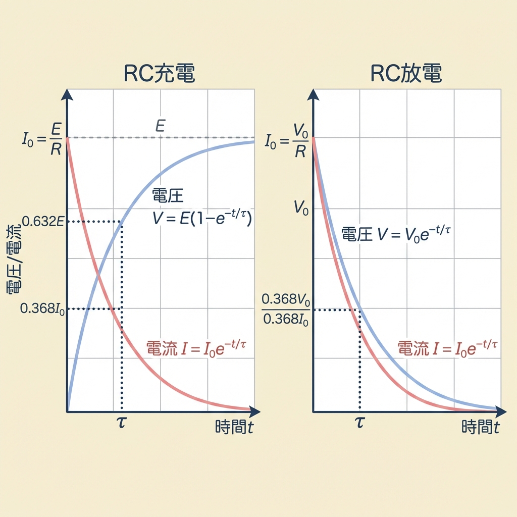 ✅ 時定数τ:RC回路なら τ = CR、RL回路なら τ = L/R。τの時点で最終値の63.2%に到達。5τでほぼ完了。
