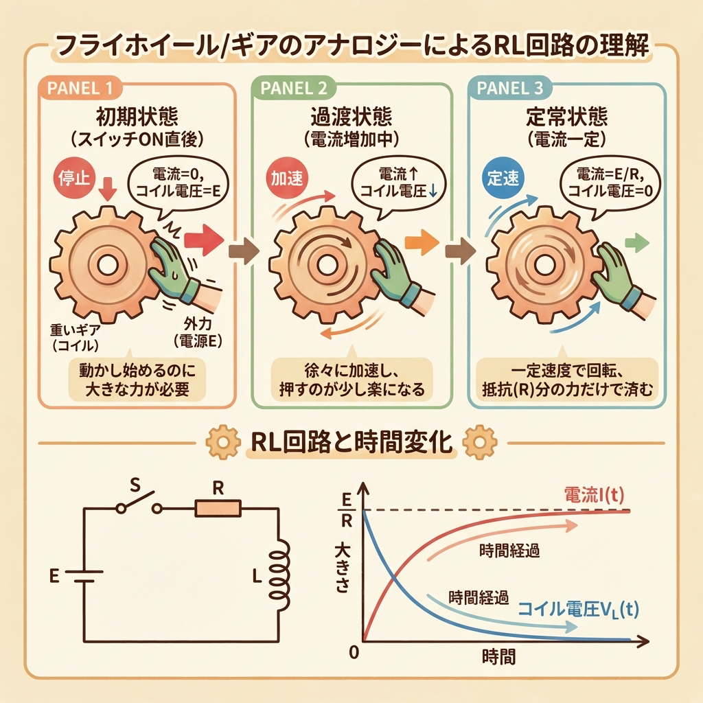 📌 例え:重い歯車を回し始めるイメージ。力を加えても、歯車の慣性で最初はゆっくりしか回らない。