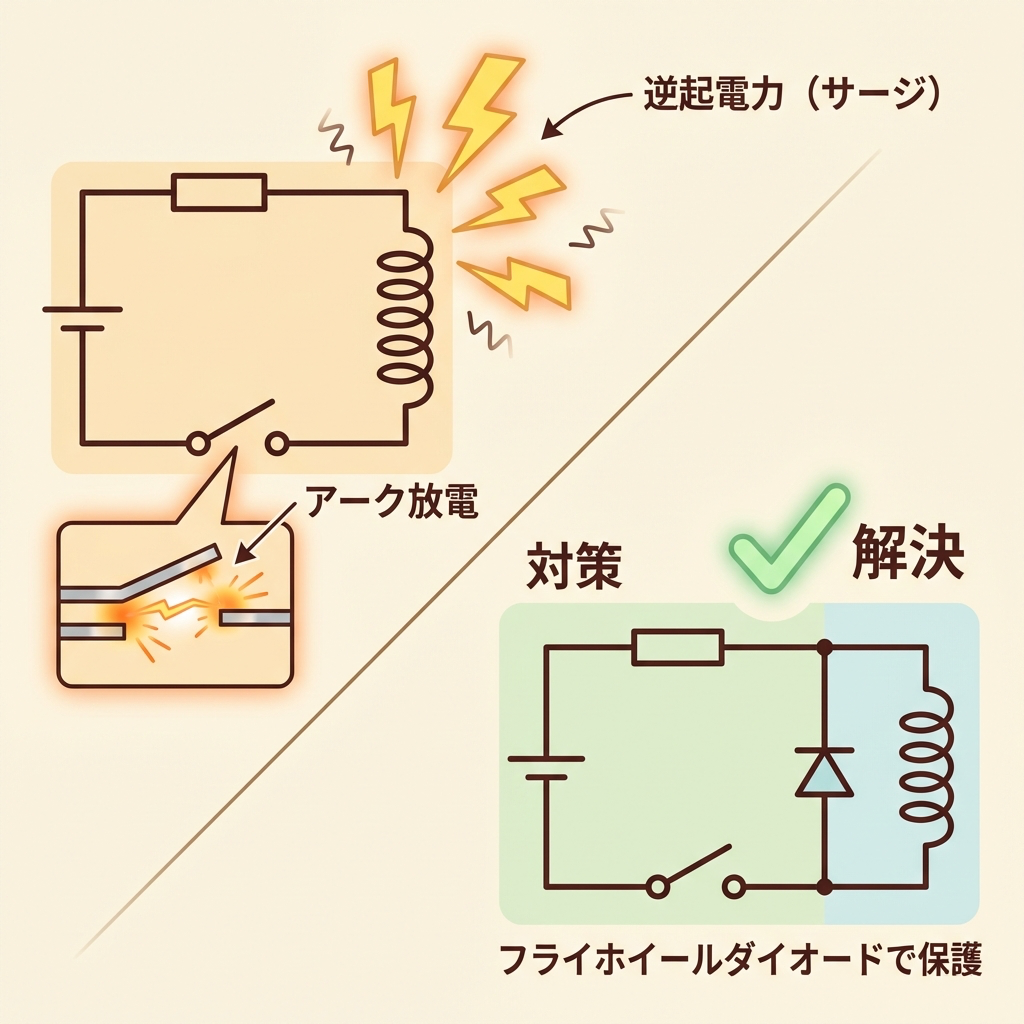コイルは「電流を急に変えられない」部品です。もし回路を単純に遮断(開放)して電流をゼロにしようとすると、コイルは「いや、電流を流し続けたい!」と猛烈な逆起電力を発生させます。この電圧は理論上、無限大になり得ます。
