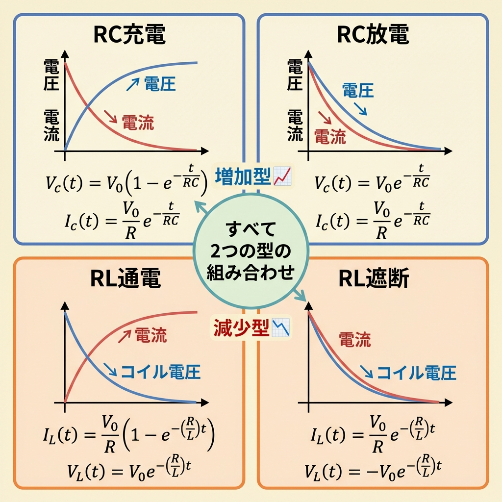 ✅ 公式は2つの型だけ:増加型(1 − e−t/τ)と減少型(e−t/τ)。すべてのRC・RL回路の過渡現象はこの2つの組み合わせ。