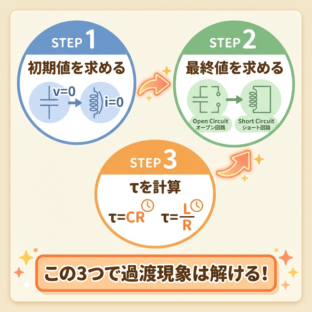 最後に、実際の試験で過渡現象の問題を解くための手順をまとめます。この3ステップを体に染み込ませれば、過渡現象は「捨て問」から「得点源」に変わります。