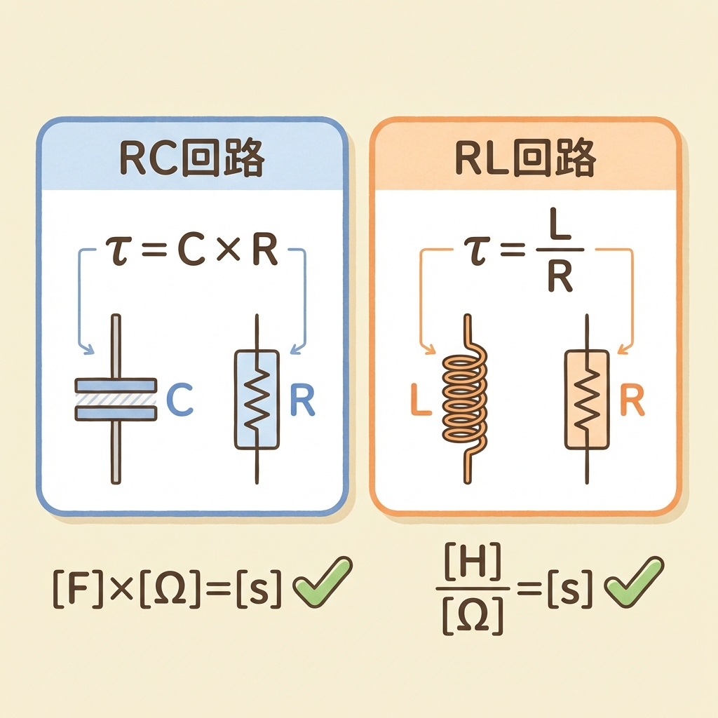 「RC回路は掛け算、RL回路は割り算」── これがよく混乱するポイントです。でも安心してください。単位を確認すれば一発で判定できます。時定数の単位は必ず「秒(s)」にならなければいけません。