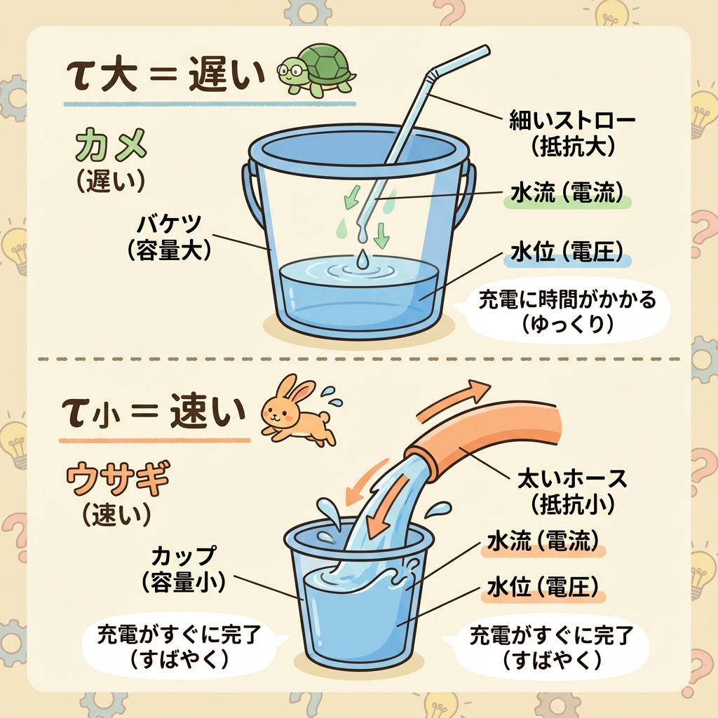 | C(容量)小 | ↓ | τ小(速い)🐇 | 小さなコップに水を注ぐ → すぐ溜まる |