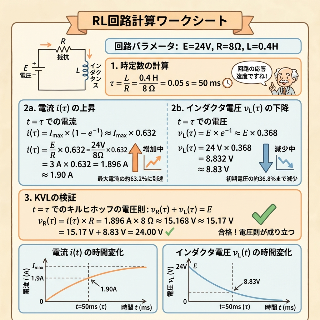 📝 例題:RL回路の時定数と1τ後の電流・電圧