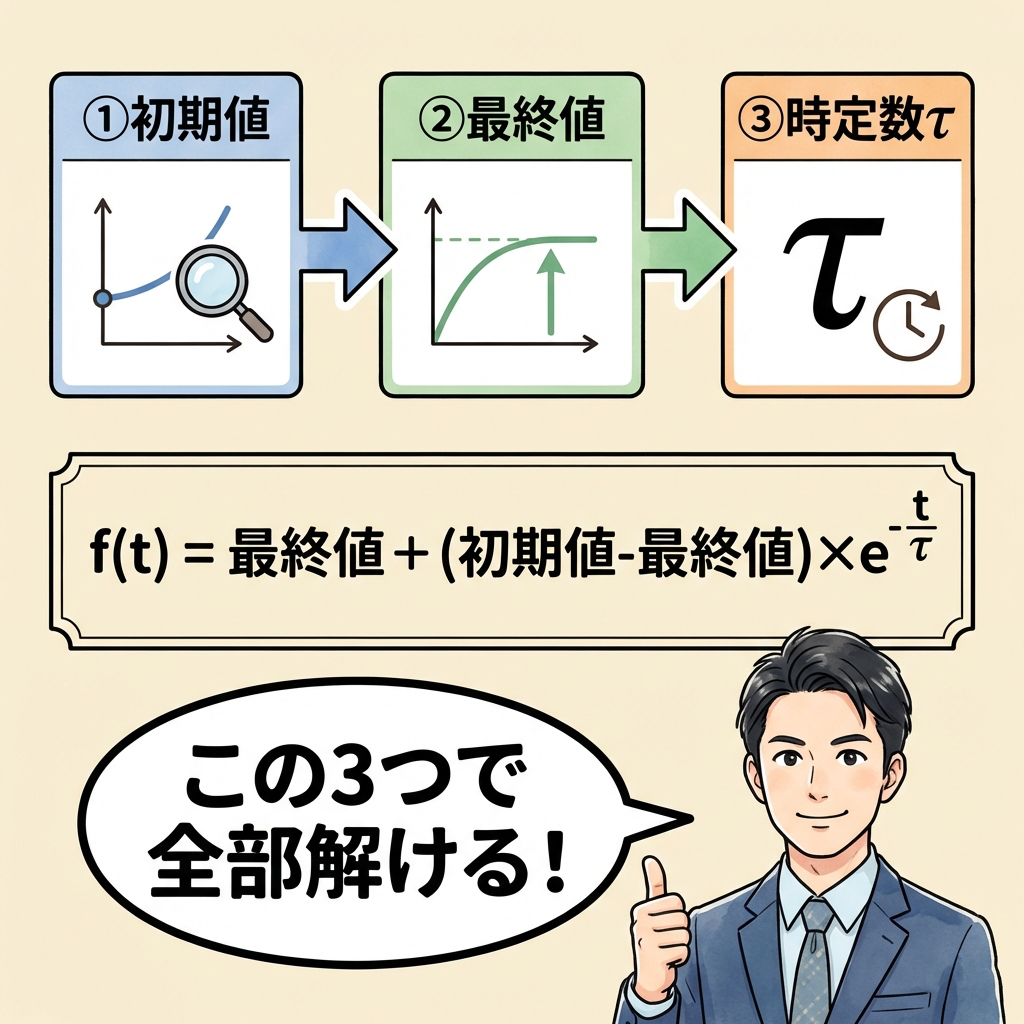 | 解法の3ステップ | ① 初期値 → ② 最終値 → ③ τ を求めて一般式に代入 |