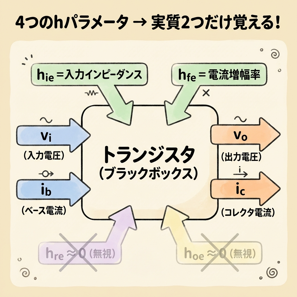 - hパラメータ4つの意味を「ブラックボックスの入口と出口」で直感的に理解する