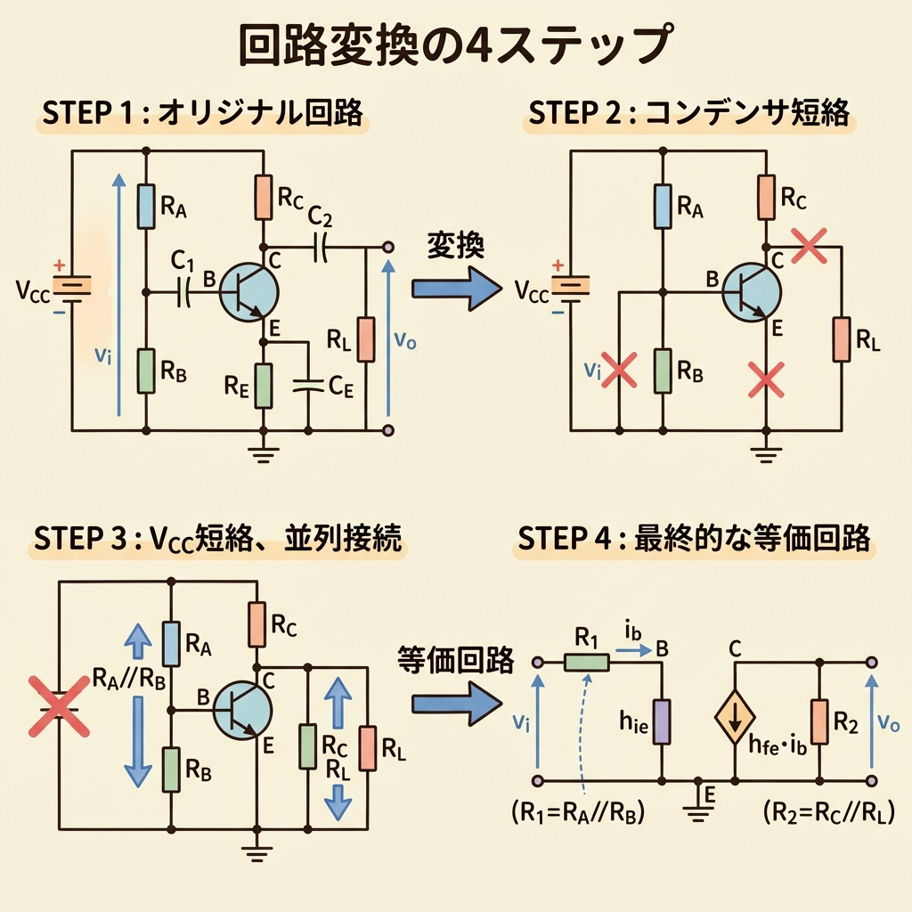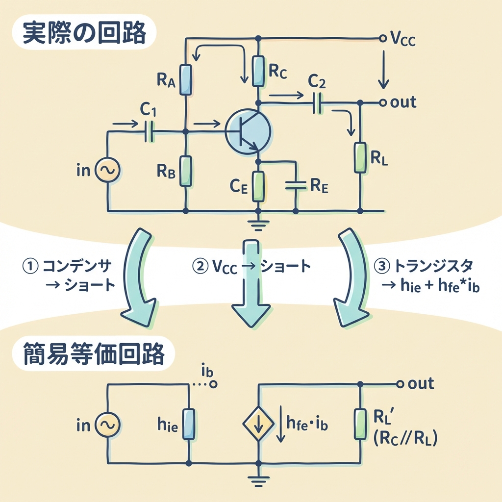 ③ 等価回路への変換ルール:コンデンサはショート、VCCはショート、トランジスタは hie + hfeib に置換