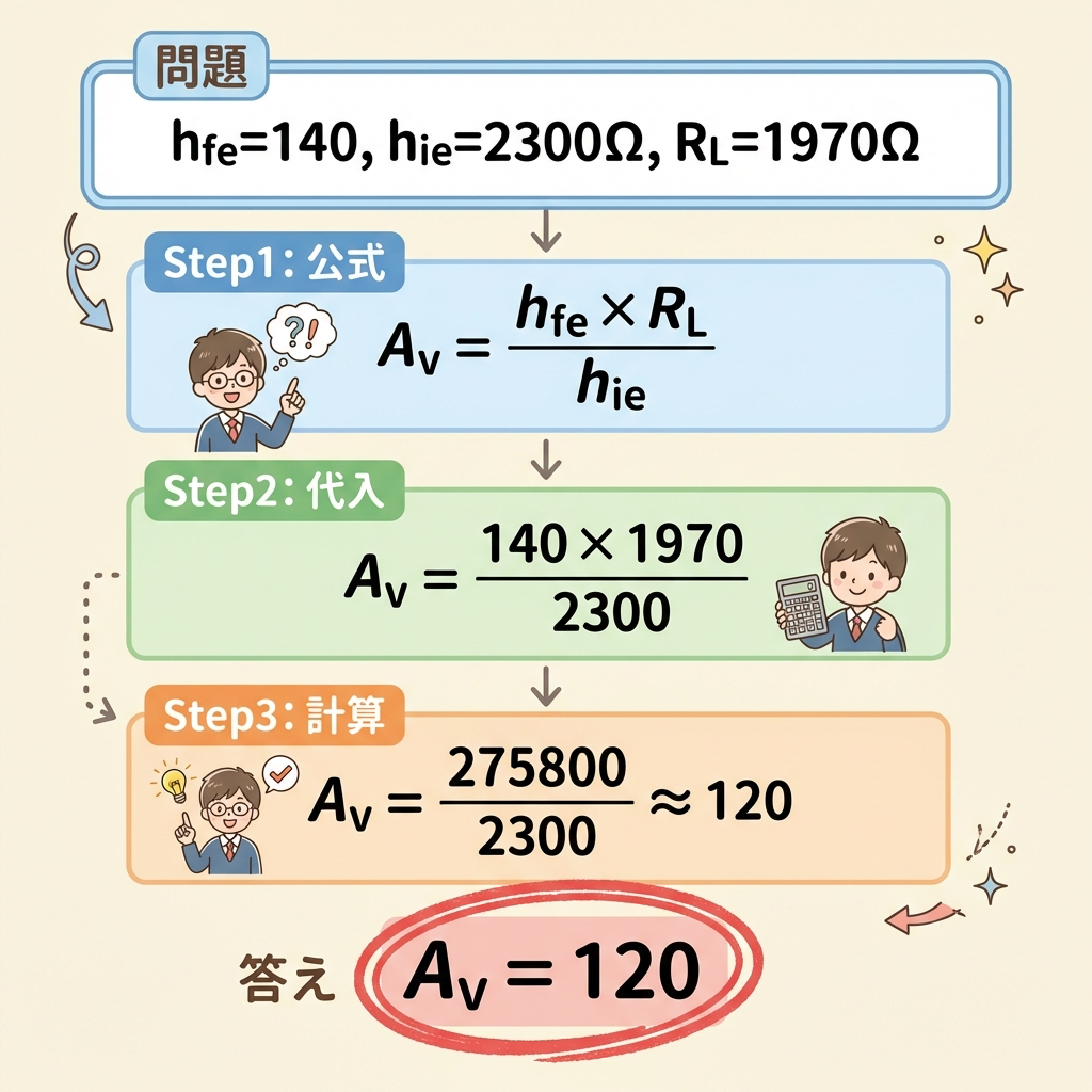 電験三種では「Av=120 のとき、RL はいくらか?」のように逆算させる問題も出ます。その場合は同じ公式を変形するだけです: