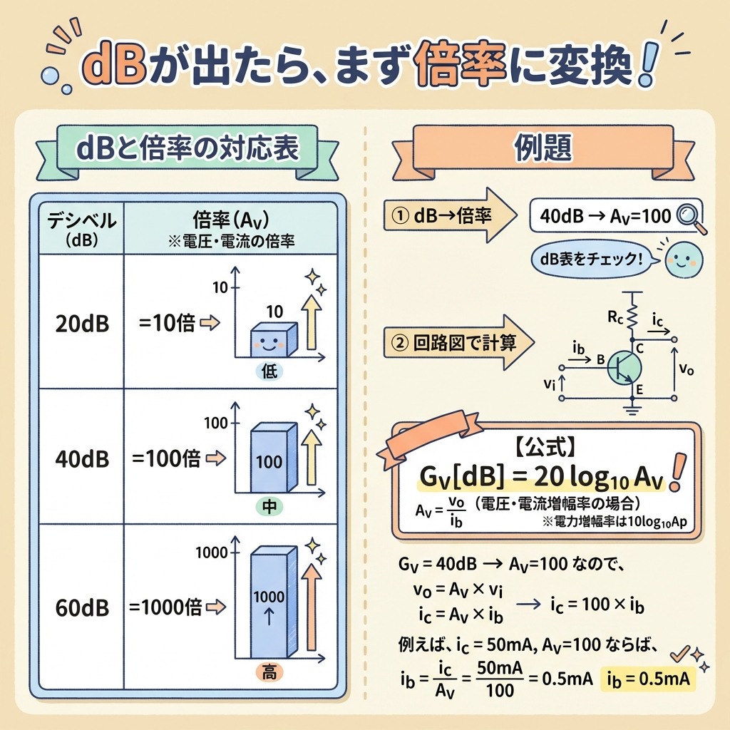 電験三種でdBが出題された場合、最初にAvの実数値に変換してしまうのがコツです。40dBなら100倍、20dBなら10倍。この変換さえできれば、あとはいつもの計算と同じです。