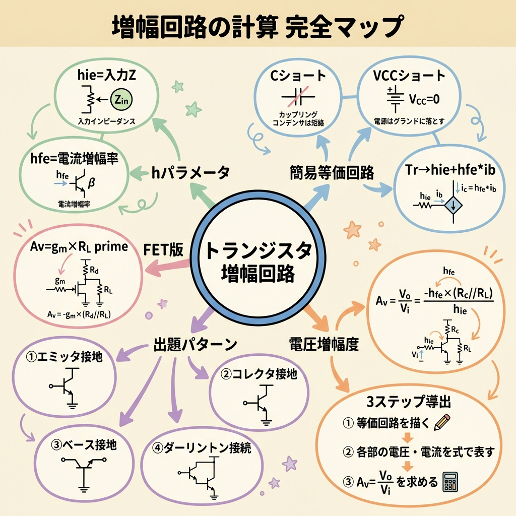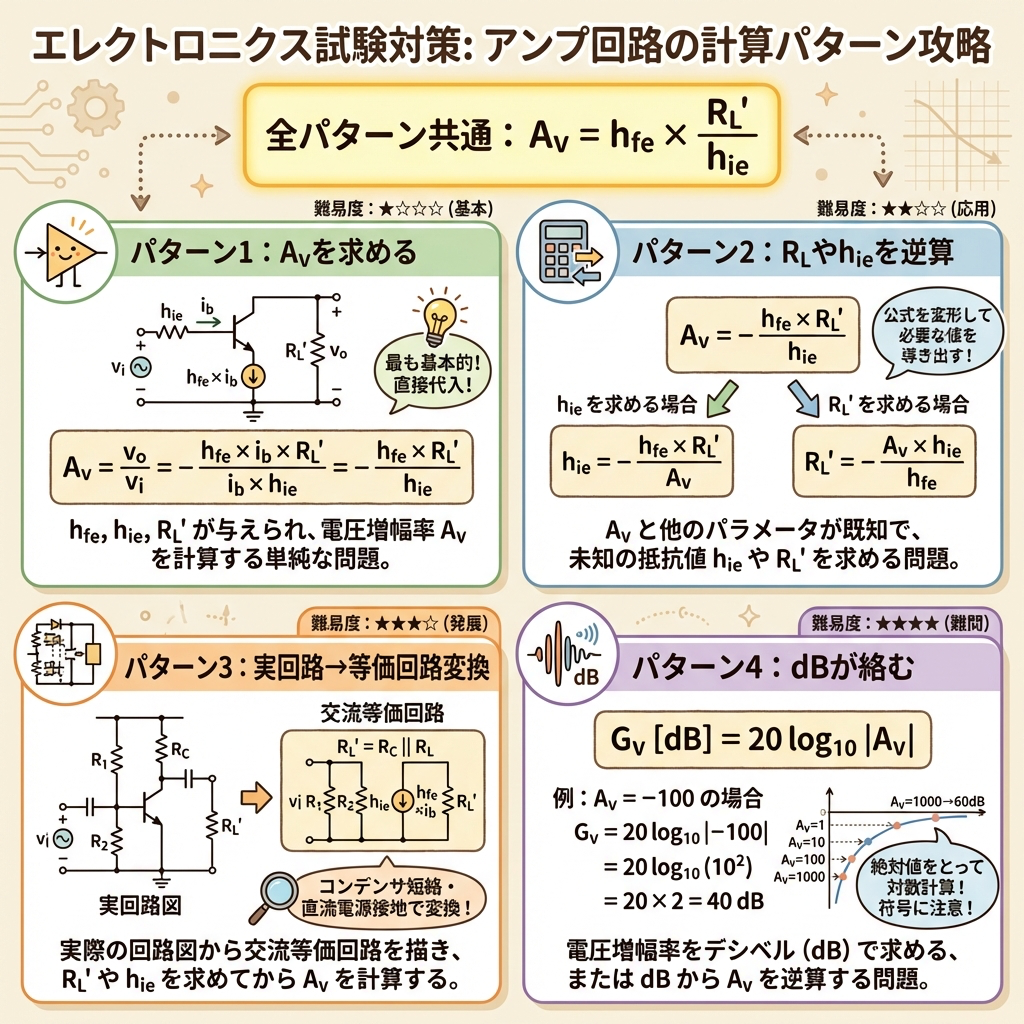 トランジスタ増幅回路の問題は、毎回形は違ってもやることは同じです。過去問を分析すると、出題パターンは以下の4つに集約されます。