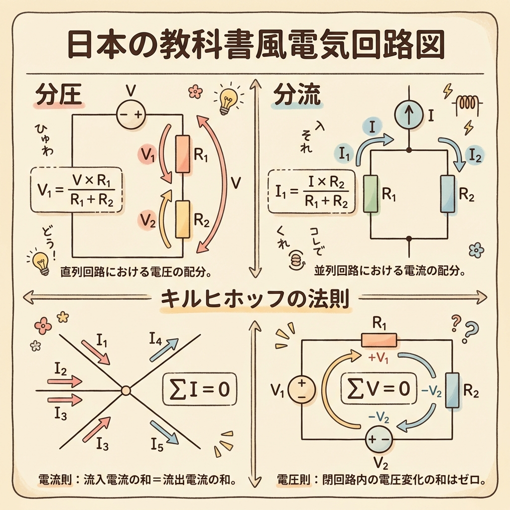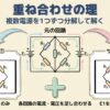 | 重ね合わせの理 | I = I₁ + I₂ + … | 電源が複数ある場合、1つずつ計算して足し合わせる。他の電源は短絡(電圧源)or開放(電流源)にする。 | — |