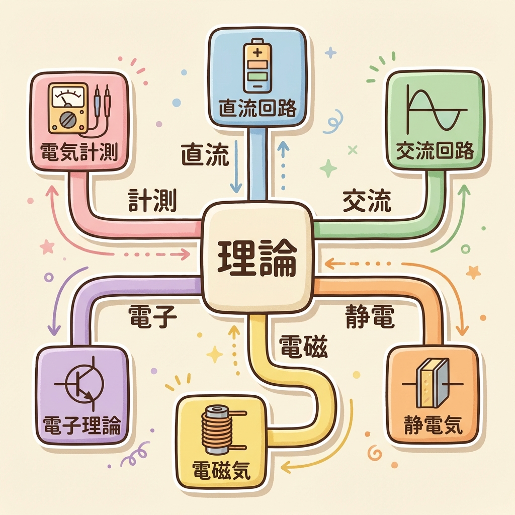 電験三種の「理論」科目は、直流回路・交流回路・静電気・電磁気・電子理論・電気計測と、カバーすべき範囲が非常に広い科目です。個別に勉強しているときは理解できていたのに、いざ試験前日になると「あれ、この公式どっちだっけ?」と記憶が混線する——これは誰もが経験することです。
