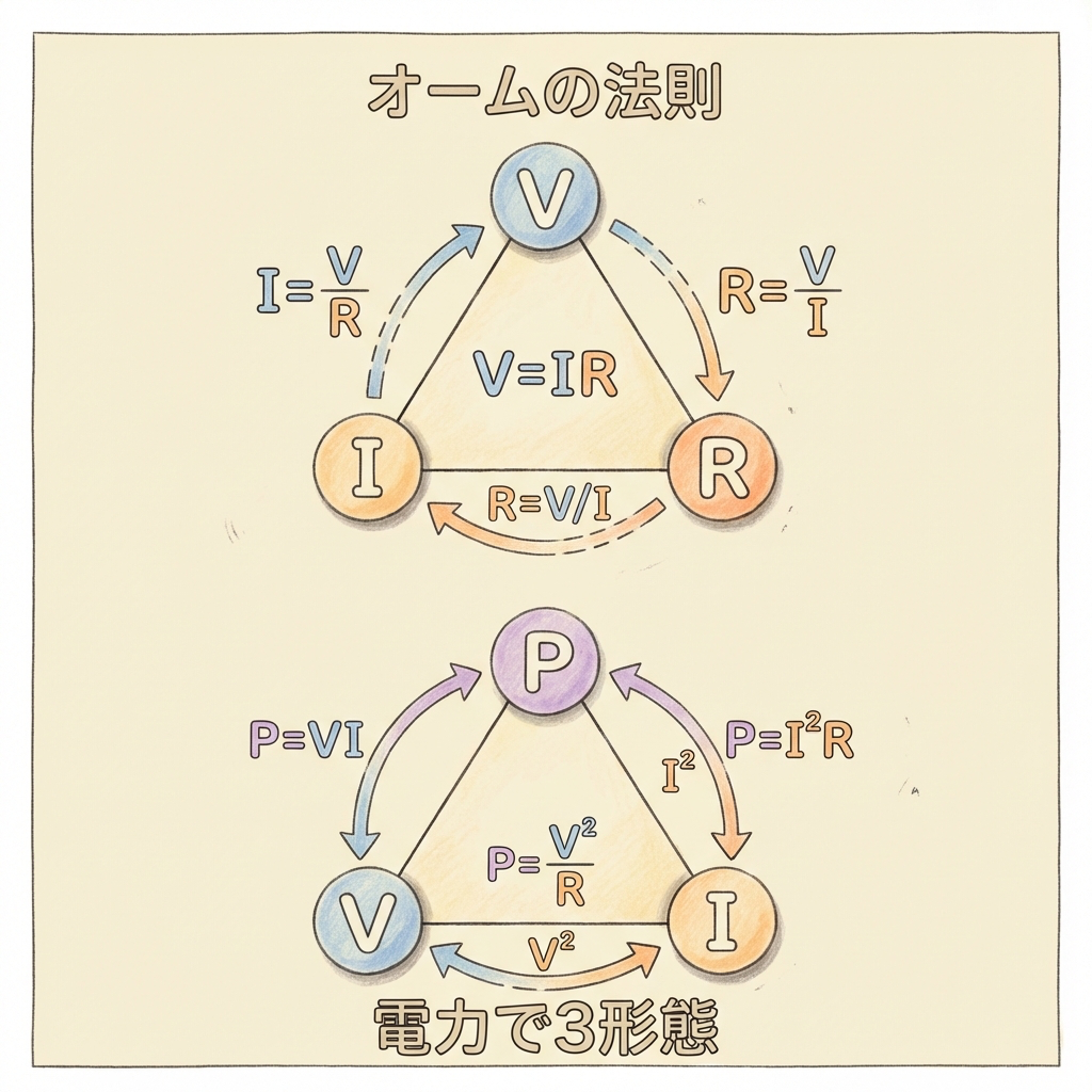 | V = IR | 電圧=電流×抵抗。すべての回路計算の大元。 | V [V]、I [A]、R [Ω] | 解説→ |