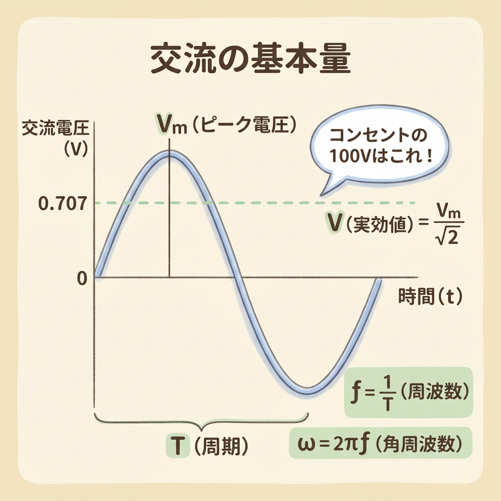 | V = Vm / √2 ≈ 0.707Vm | 実効値=最大値÷√2。「コンセントの100V」はこの実効値のこと。直流に換算した等価の値。 | 解説→ |