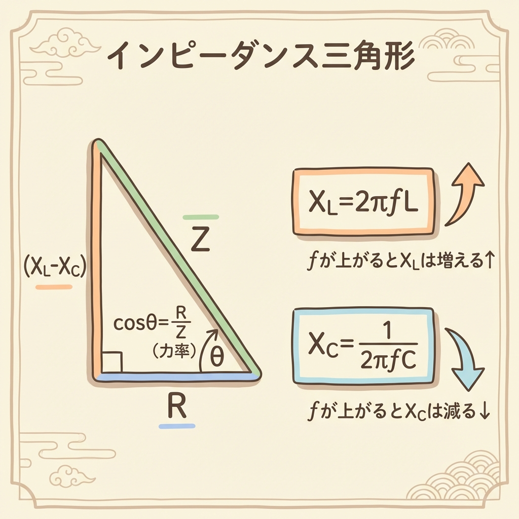 | Z = √(R² + (X_L - X_C)²) | RLC直列回路のインピーダンス。直角三角形の斜辺=Z、底辺=R、高さ=(X_L - X_C)。 | 解説→ |