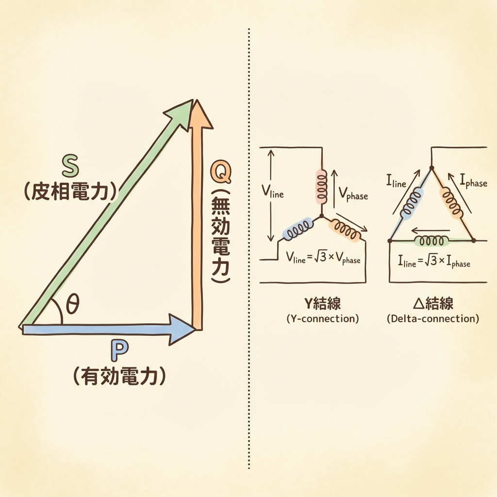 | S² = P² + Q² | 電力三角形。三平方の定理がそのまま成立する。 | 解説→ |
