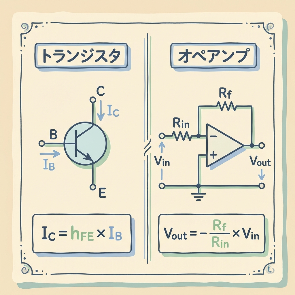 | 非反転増幅回路 | V_out = (1 + R_f / R_in) × V_in | 出力=入力×(1+帰還抵抗/入力抵抗)。位相は反転しない。倍率は必ず1以上。 | 解説→ |