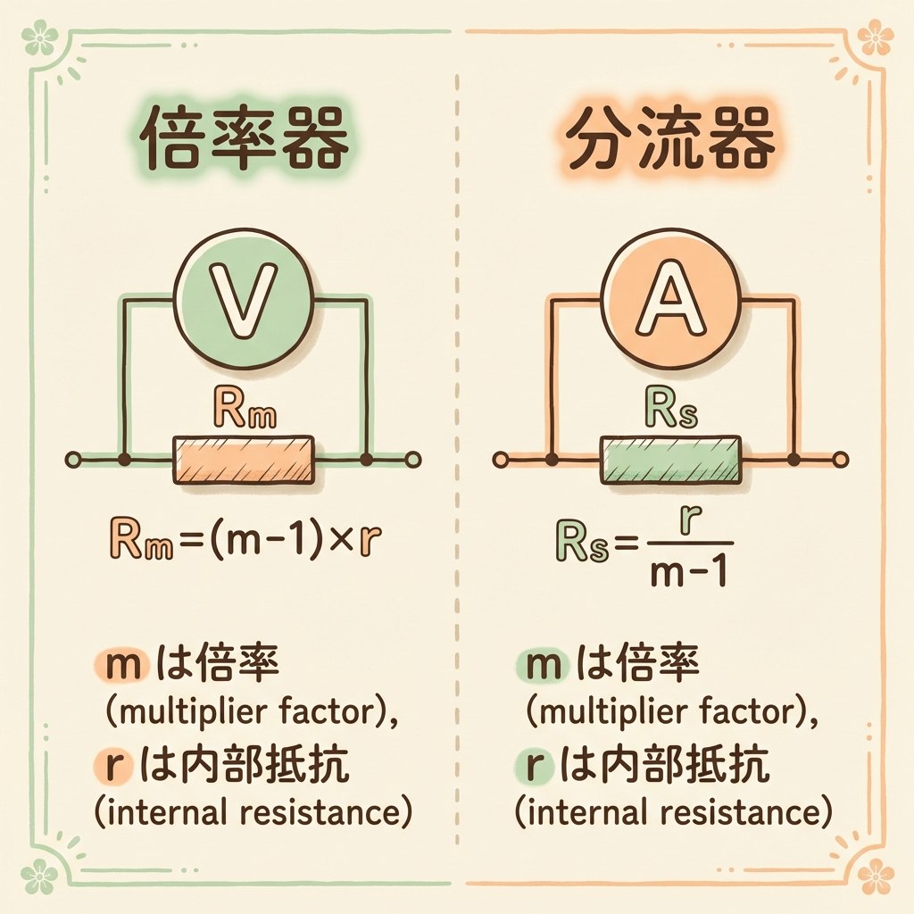 R_m = (m - 1) × r | 電圧計に直列に抵抗を接続して測定レンジを拡大。mは倍率(=測定したい電圧÷計器の最大電圧)、rは計器の内部抵抗。 | 解説→ |