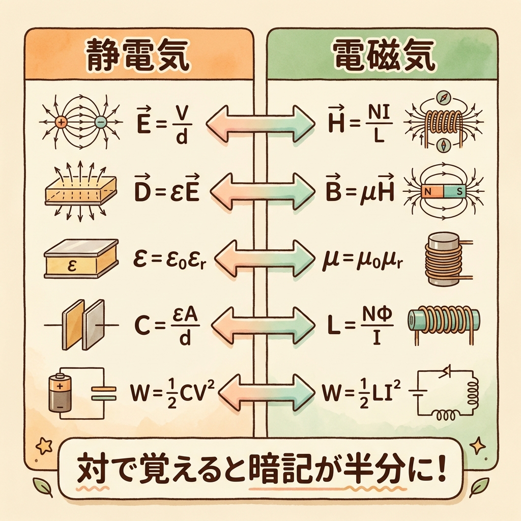 試験では「静電気と電磁気のどちらの公式だったか」を混同するミスが多発します。以下の対比表を頭に入れておけば、混乱を防げます。