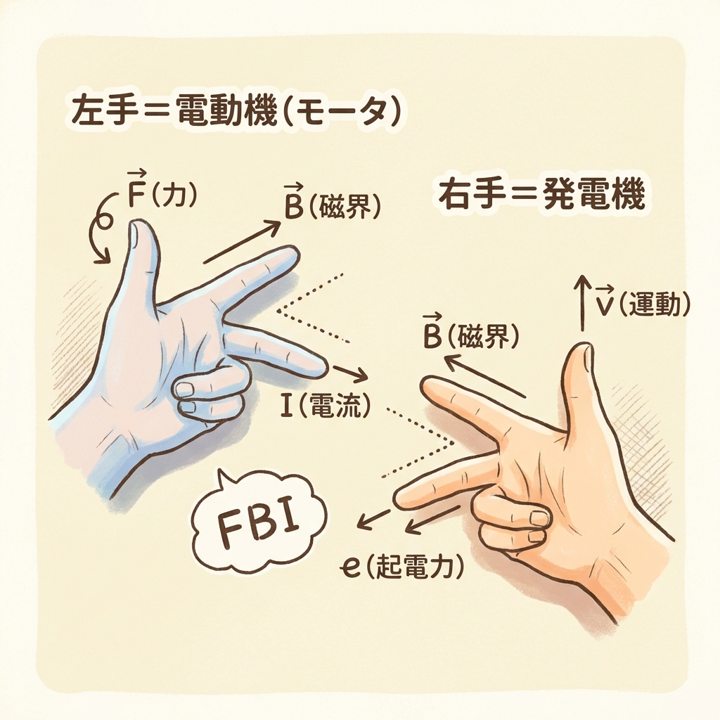 「電動機(モーター)=左」 「FBI」(親→人→中) |