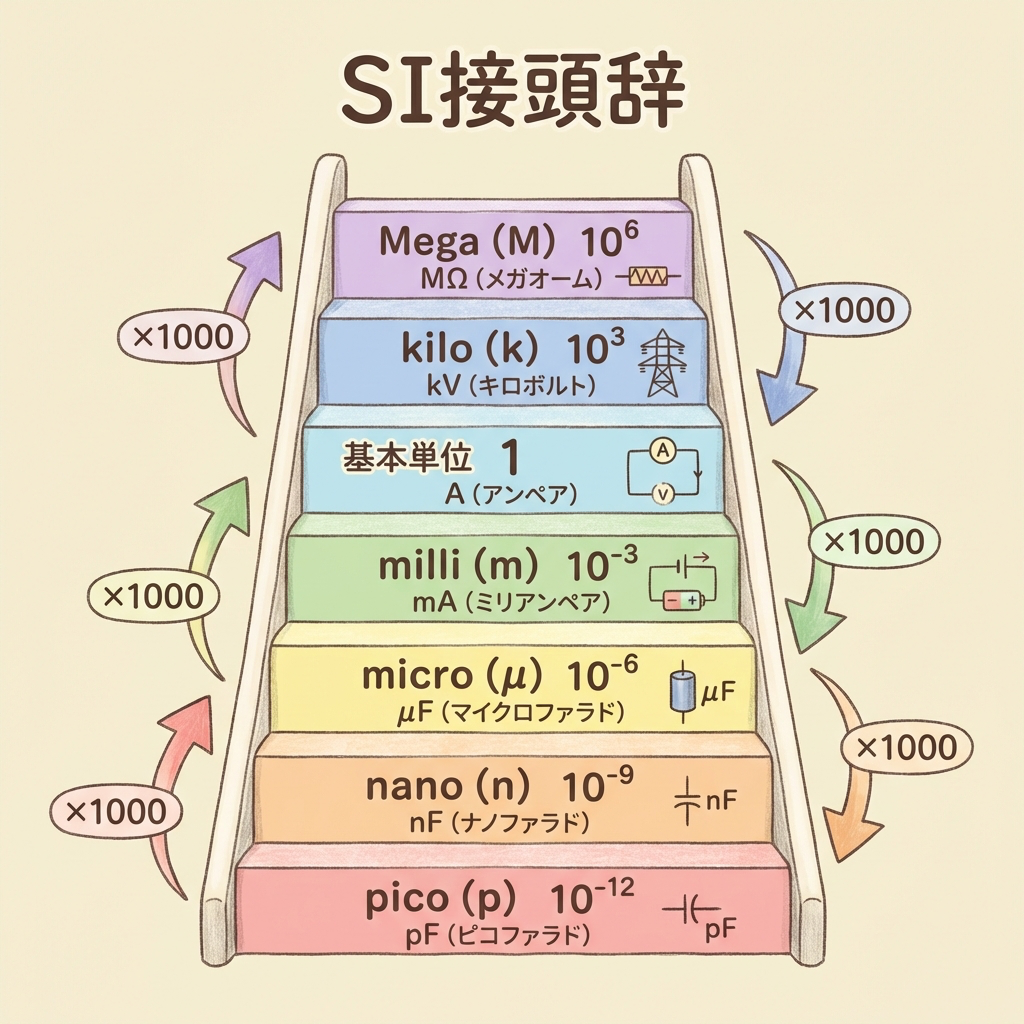 電験三種の計算問題では、μF(マイクロファラッド)やmH(ミリヘンリー)など、SI接頭辞の変換ミスが致命的な失点につながります。以下の表を頭に入れておきましょう。