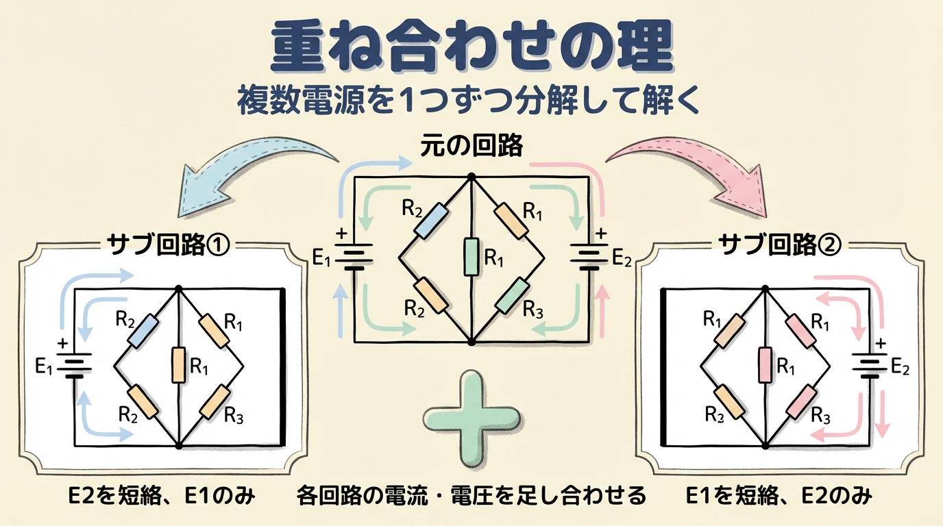そこで登場するのが「重ね合わせの理(重ねの理)」です。この方法を使えば、複数の電源がある複雑な回路を「電源1つだけの簡単な回路」に分解して、最後に足し算するだけで答えが出ます。