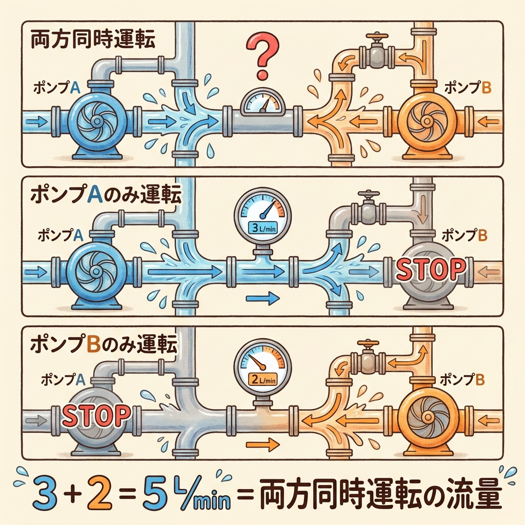 ある工場に2台のポンプ(ポンプAとポンプB)が設置されていて、同じ配管ネットワークに水を送り込んでいるとします。