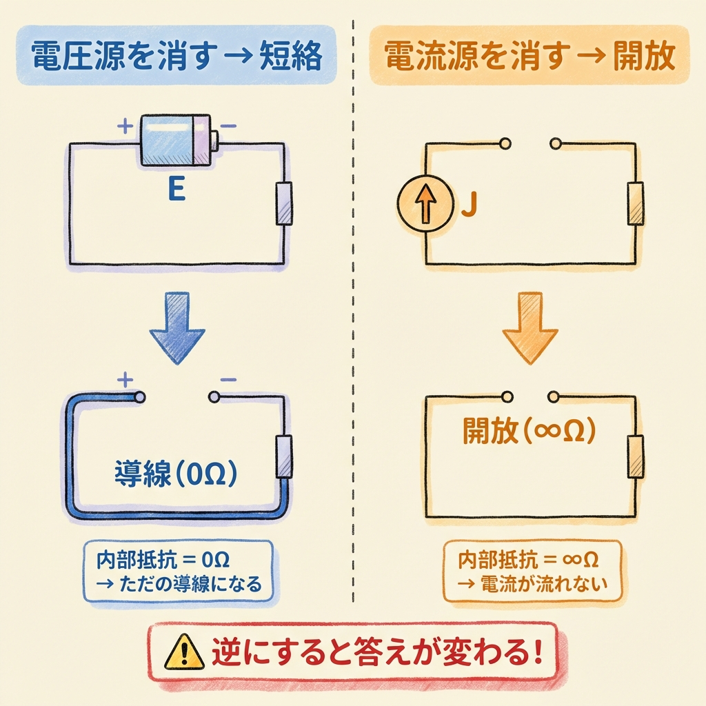 これを逆にすると答えが全く違ってしまいます。覚え方は「電圧源は内部抵抗0Ω → 0Ωの導線」「電流源は内部抵抗∞Ω → 電流が流れない → 切り離し」です。